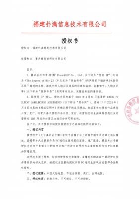 福建撲滿信息技術有限公司注冊地位于福建省福州市,是國內(nèi)《熱血傳奇》客戶端游戲獨占性版權人。對《熱血傳奇》客戶端游戲擁有全部版權,并有權基于版權權利進行該游戲維權。株式會社傳奇IP (以下簡稱傳奇IP )對《The Legend of Mir 2》(中文名為“熱血傳奇"、或“傳奇”、“傳奇2”、“MIR II”)游戲(以下稱為 “授權作品”) 共同享有充分、完整且有效的著作權。經(jīng)傳奇IP授權 , RENAISSANCE INVESTMENT MANAGEMENT LIMITED (以下簡稱 RENAISSANCE Ltd.)有權在中國大陸地區(qū)獨占性地對授權作品的網(wǎng)絡客戶端游戲進行開發(fā)、 發(fā)行、管理、宣傳、推廣和運營,針對授權作品的侵權游戲及侵權方,RENAISSANCE Ltd.有權采取必要的措施,并有權將前述權利分授權給第三人。福建撲滿信息技術有限公司經(jīng)RENAISSANCE Ltd.授權,獲得上述權利,有權在中國大陸地區(qū)獨占性地對授權作品的網(wǎng)絡客戶端游戲進行開發(fā)、發(fā)行、管理、宣傳、推廣和運營,并有權對侵權行為/主體采取維權措施。